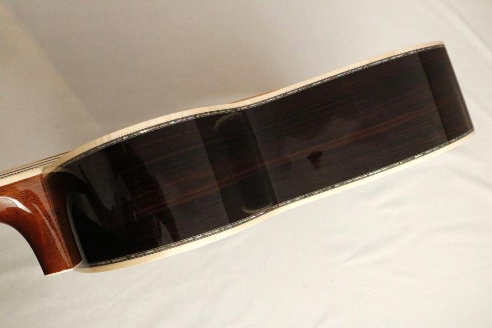 一方で小ぶりなサイズの魅力である音の立ち上がりの良さとStyle45の残響感を兼ね備えた独特な響きはアーチトップギターのような印象もあり、Jazzy な4つ切りのバッキングや、ラグタイム、ボサノバ等の軽快なベース音を必要とする演奏、さらにはハイポジションでの単音弾きでも存在感のある響きで響いてくれます。
