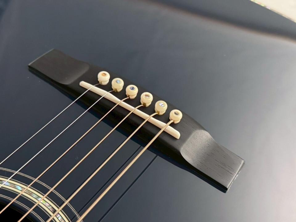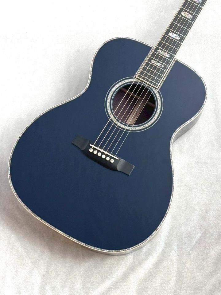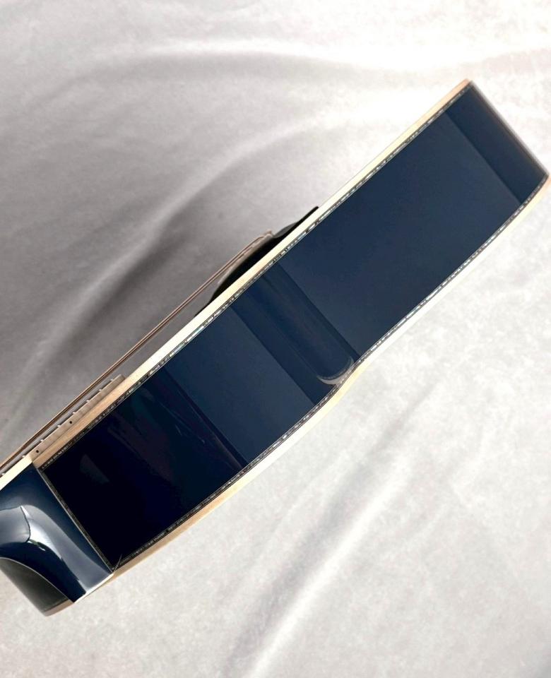 最上位グレードのシトカスプルースとインディアンドーズウッドの組み合わせにより小ぶりなサイズながら安定感と、透明感のある響きになっていて、弦の一本をはじいてサウンドホールに耳を傾けるとボディ内に残る響きがゆっくりと減衰していき長い余韻を持って響いていることが分かります。632mmの少し短めの弦長から弦の張りが柔らかく、軽くつま弾いた際の小さな音量の中であっても暖かみのある響きが感じられます。フィンガースタイルはもちろんの事、ストロークでも空間を埋めるような存在感を持ち、非常に気持ちの良い響きで鳴ってくれます。ネイビーブルーの魅力的なカラーリングで杢目はあまり見えませんがプレミアムグレードの木材は外観や杢目だけでなく、美しいサウンドにも大きな影響を与えています。上質な材と豪華な装飾、魅力的なカラーリング、それぞれがの魅力が一つ一つ強く感じられる一本。是非この機会にお手に取ってみてください。