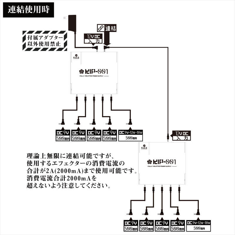 またKIP-001はフルアイソレートになっている為、カレントダブラーやデイジーチェインケーブル等を使って1,000mA消費電流対応も可能ですが、上記同様に筐体上面が熱を持つ事がございます。