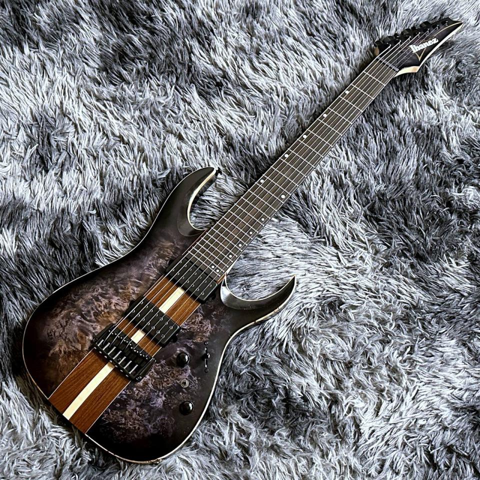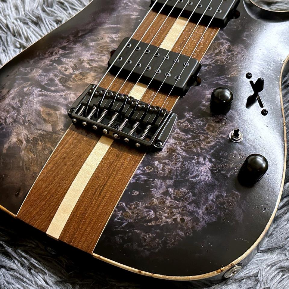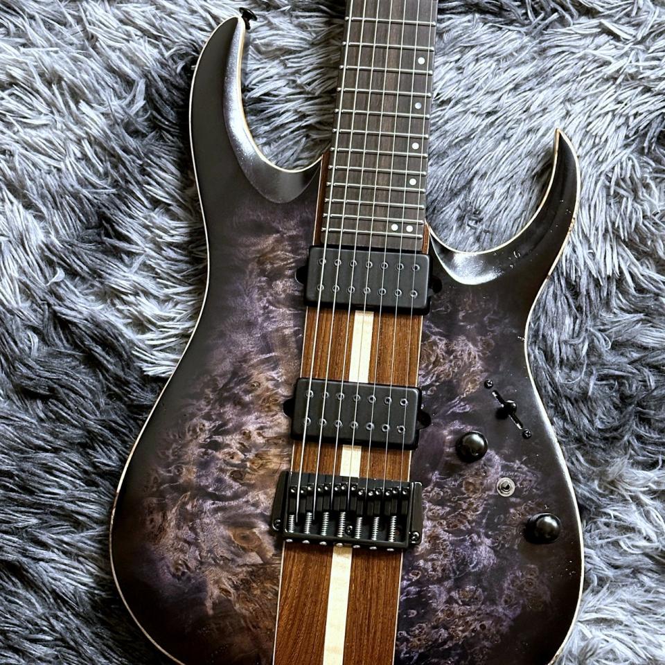 dyna-MIX10 スイッチングシステムを搭載、ラミネート材ボディトップにブラックを基調としたDeep Twilight Burst カラー・ローグロスフィニッシュが映えるRGA Premium7弦・・・