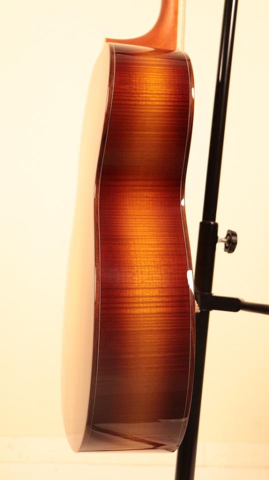 サイド&バックには、オーストリアン・フレイム・メイプルを採用。独特の美しい杢目が視覚的な魅力を高めるだけでなく、メイプル特有のクリアで明瞭なサウンドキャラクターを生み出します。高音域の抜けが良く、アタック感のあるサウンドが特徴であり、特にフィンガースタイルの演奏において繊細なタッチを忠実に再現します。