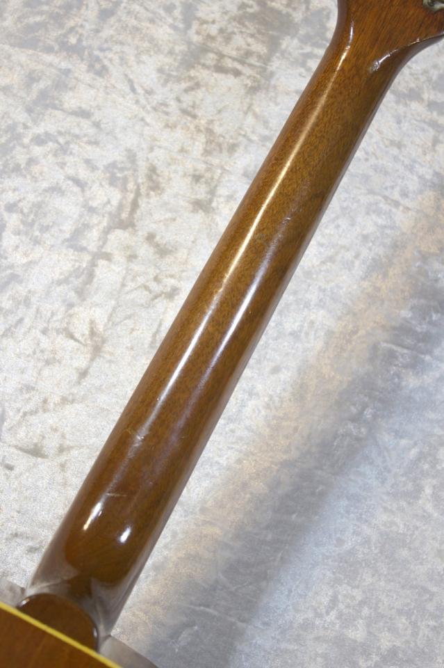 ラージピックガード左上部のラインに沿って発生したトップ割れの補修で接着した跡があり、補修からはだいぶ年数が経過しているようです。ヘッド回りは長い年月の間にだいぶぶつけてきたのか、角が削れております。
