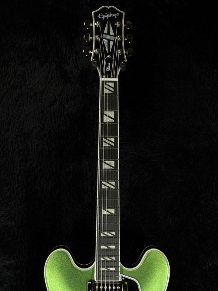 5プライ・バインディング仕様のカラマズー・ヘッドストックには、ロッキングGrover RotomaticチューナーとGraph Techナットを備え、マザー・オブ・パールによるエピフォン・ロゴとカスタム・スプリットダイヤモンド・インレイが施されています。