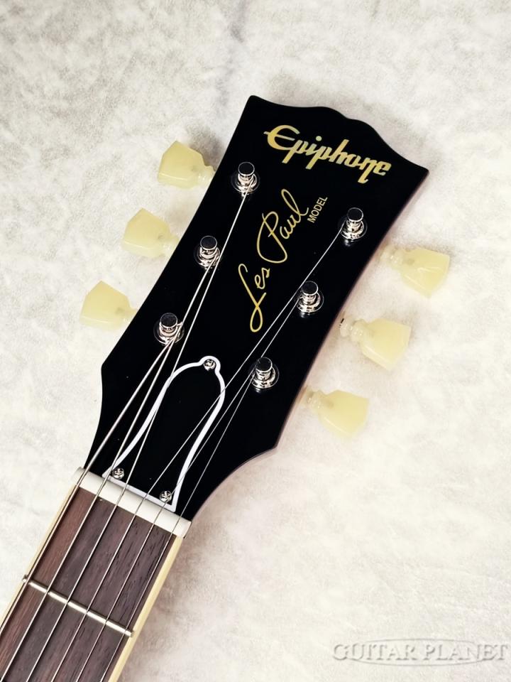 また、ヘッドストックにはマザー・オブ・パールの台形指板インレイ、エイジド加工を施したマザー・オブ・パールのEpiphoneヘッドストック・ロゴ、そしてギブソン・スタイルの「オープン・ブック」ヘッドストックに金色でシルクスクリーン印刷された「Les Paul Model」の文字が特徴。