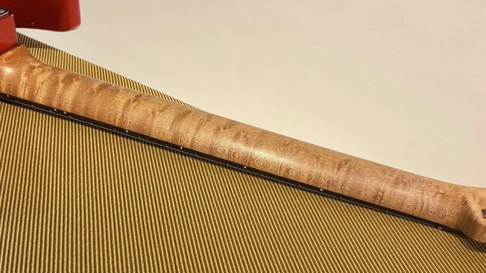 ボディはホロウのアルダー、バーズアイメイプルネックにブラジリアン・ローズウッド(ハカランダ)指板と豪華なウッドマテリアルです。とても軽量2.9kg!!