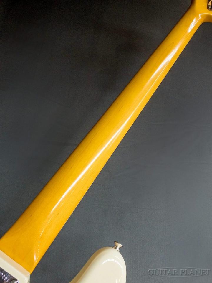 オーソドックスな木材構成、アルダーボディ、メイプルネック、ローズウッド指板の組み合わせに、ネックバインディングやマッチングヘッド仕様、パドルペグといった1966年当時の仕様をきちんと押さえているかと思いきや、指板のポジションマークはドットポジション。1966年以降も続くブロックポジションではなく、過渡期のドットポジションを採用している部分に強いこだわりを感じます。