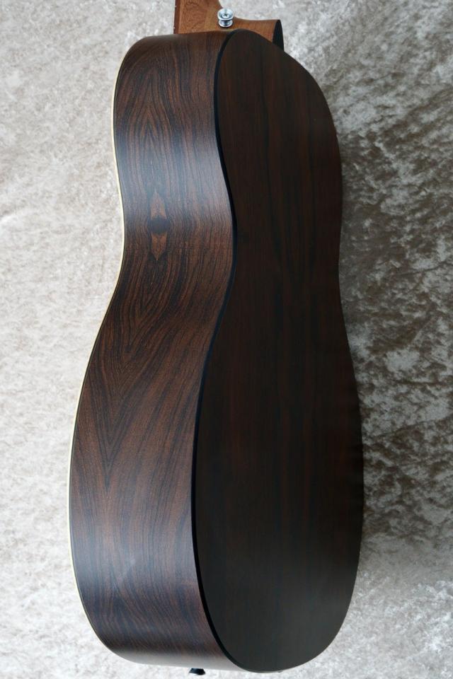 フルサイズギターの中で比較低小ぶりでくびれも深い為に抱えやすく、音色の高音域から低音域までのバランスが良いのが魅力。