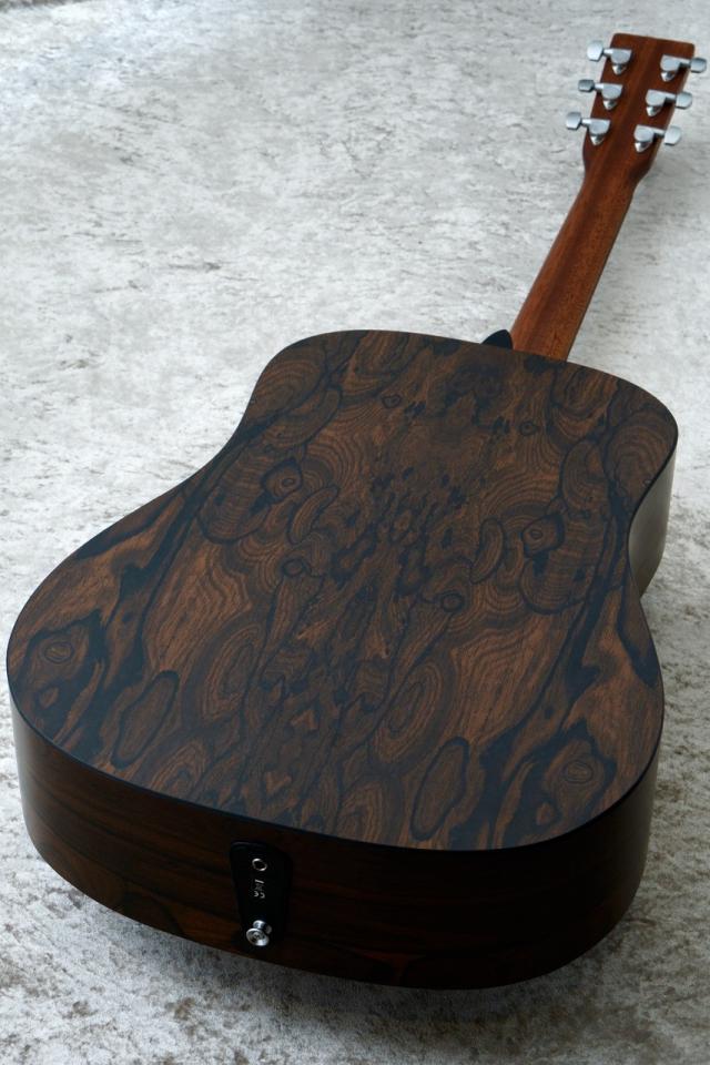 D-X2Eはトップにスプルース単板、サイド&バックにはHPL(ハイプレッシャーラミネート)と呼ばれる人工材をボディに採用しております。