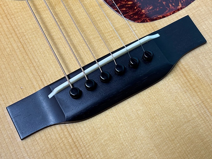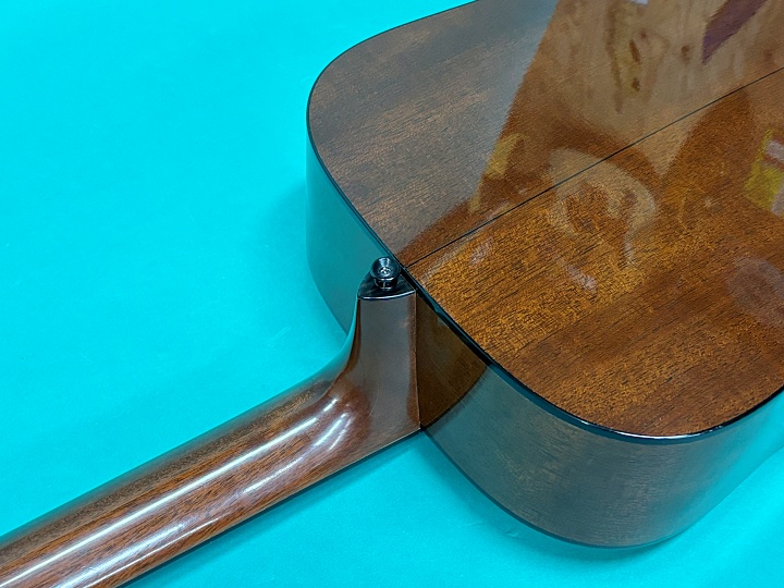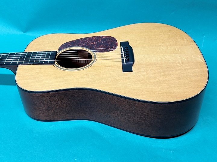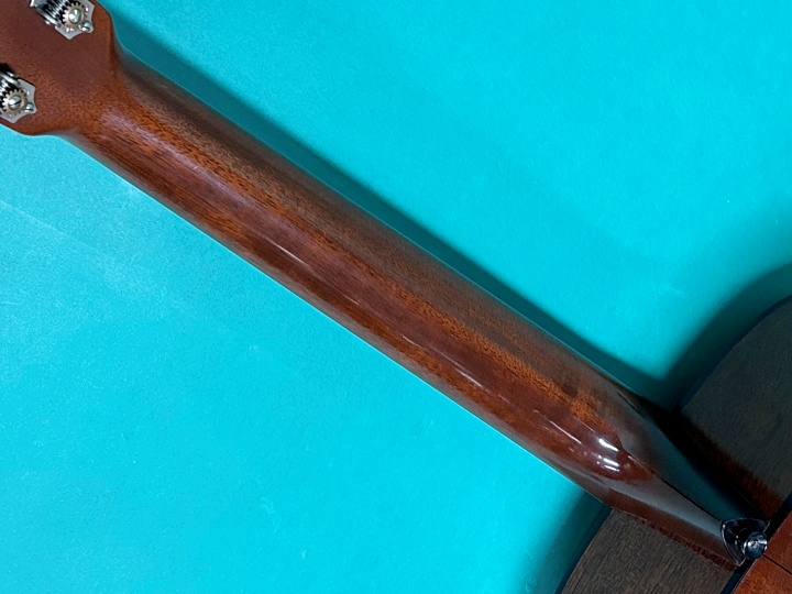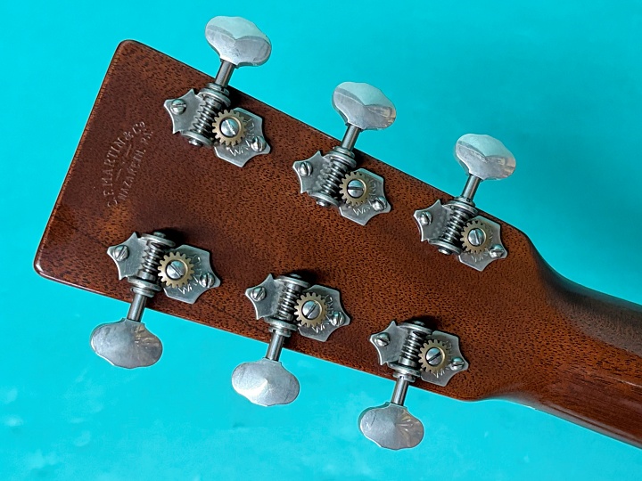 ボディトップは戦前マーチン同様にアディロンダック・スプルース、サイド&バックはジニュイン・マホガニー、ネックもジニュイン・マホガニー、指板はエボニー、ブリッジはエボニーのロングスロット仕様です。ヘッドプレートはハカランダ、精度の高いウェイバリー4060オープンバックチューナーがマウントされています。実用には関係ありませんが、ペグのニッケルメッキにはくすみがあります。