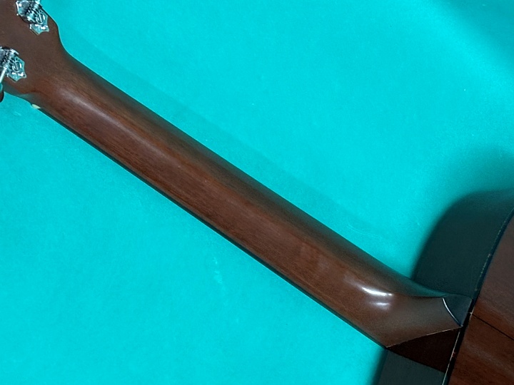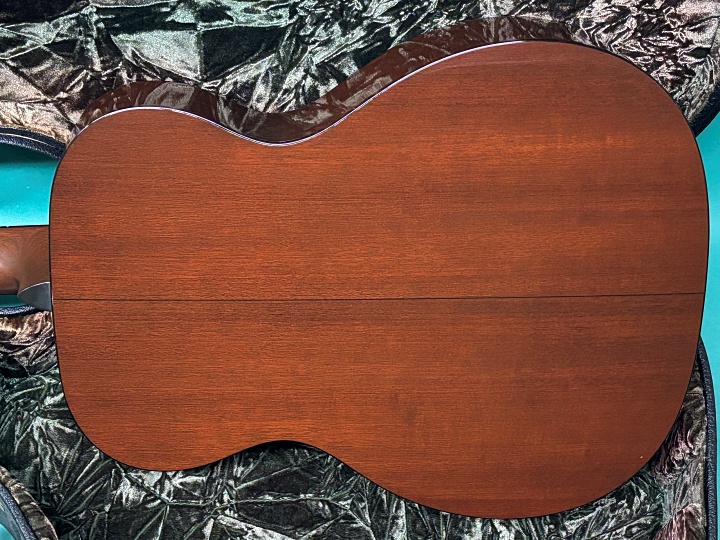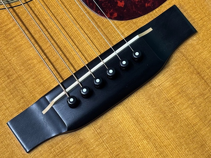 トップはシトカ・スプルース、サイド&バックはマホガニー、ネックもマホガニー、指板・ブリッジはエボニー仕様です。ナット幅は44.5mm、スケールは632.5mm、ネックシェイプにはModified V Shapeが採用されています。ブレイシングパターンもスキャロップド・ブレイシングで、ロングスロットサドル、ペグもオープンバックのバタービーンタイプを採用したヴィンテージライクな仕上がりです。ペグもオリジナルで、若干のくすみはあるものの動作はスムーズです。