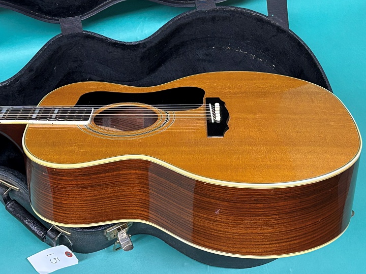 D-55に並ぶ当時のギルド最高峰モデル、艶のある華やかな響きで豊かなサスティーン感のある鳴りが特徴の17インチジャンボローズウッドモデルです。