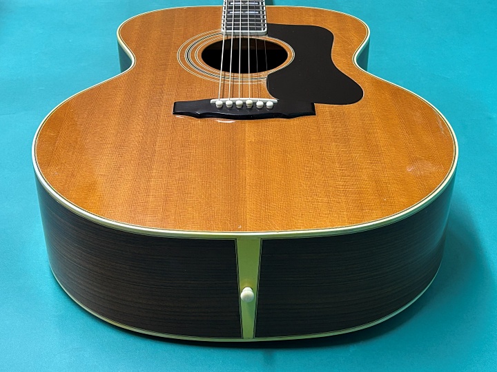 全体に綺麗な状態で、トップは色焼けしていて渋い色合いです。トップ向かって右端にぶつけたらしい塗装チップ箇所があります。ほかにも細かな表面的なキズはありますが、半世紀近く経過したギターとは思えないくらい綺麗なコンディションです。