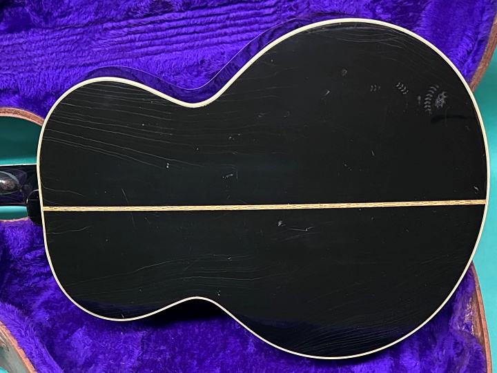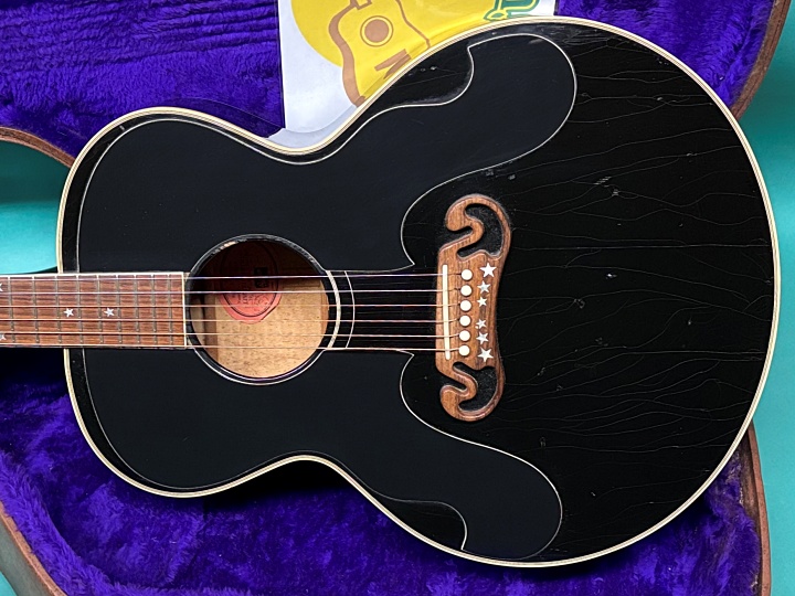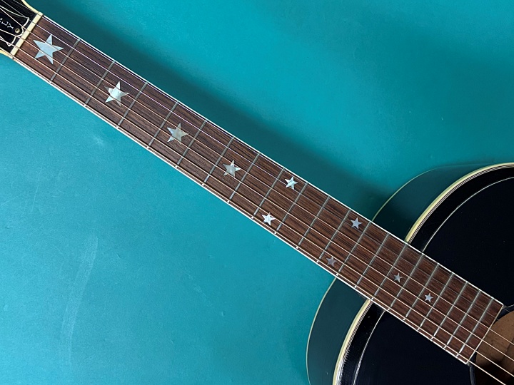 16インチのスモールジャンボボディー、ボディートップはスプルース、サイド&バックはメイプル、メイプルの3ピースネック、ローズウッド指板、ローズウッドのムスタッシュブリッジ仕様です。ヘッドトップ、指板、ブリッジには星形インレイが施され、ブラックのダブルガード、トラスロッドカバーには【EVERLY】と刻まれています。グローバー風のゴールドペグはメッキの褪色やポツサビはありますが、動作はスムーズです。ナット幅は43.8mm、スケールは約628mmで、ナットはオリジナル、サドルは交換されています。