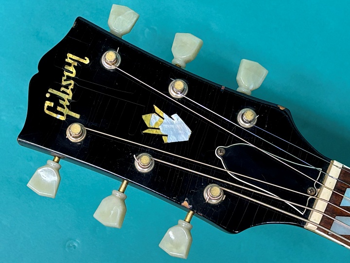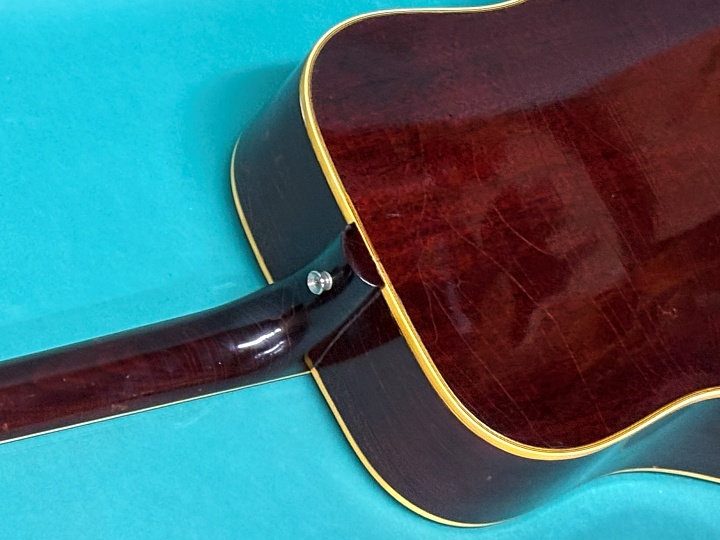 渋く焼けてバリバリウェザーチェックが入り、大変渋いルックスで6弦側上部にクラックの補修はあります。とは言えこの年代のビンテージとしてはかなり良い状態で、もちろん演奏性はしっかりとメンテナンス済みです。