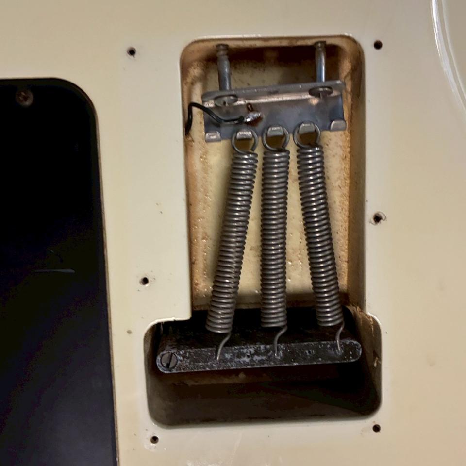 使用に伴う傷や打痕が多数見られます。フロントピックアップ、レバースイッチ交換済み。電装系はほぼ再配線されております。アーム欠品。演奏面は良好なコンディションです。