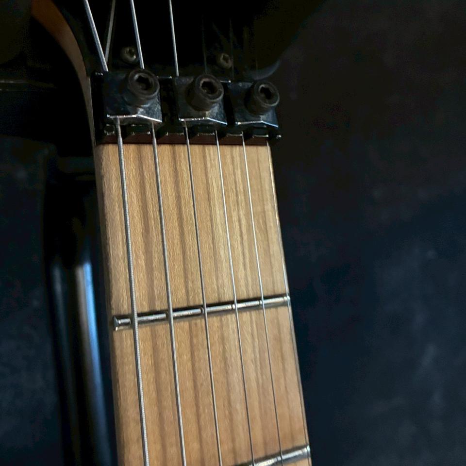 ネックは非常に薄めで、Ibanez系を思わせるスリムでスピーディーな握り心地です。テクニカルなフレーズや速いポジション移動にも自然に対応しやすく、軽快な演奏感を求める方には特に魅力的なポイントです。