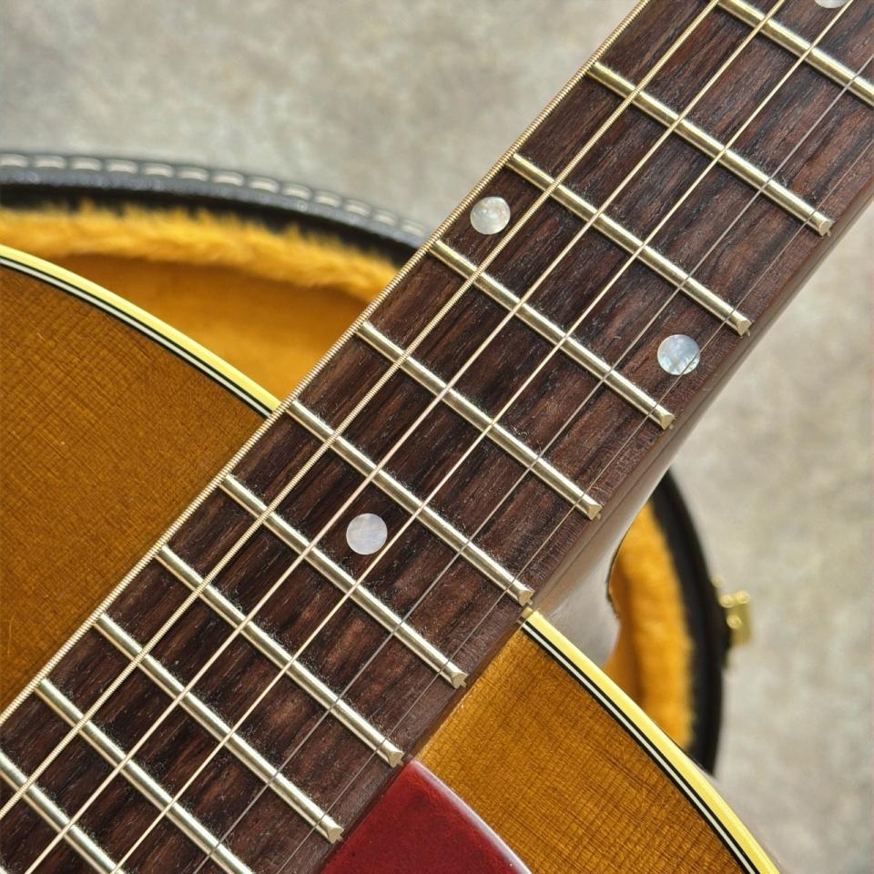 ローズウッド指板には、マザーオブパールのドットインレイが配置されています。