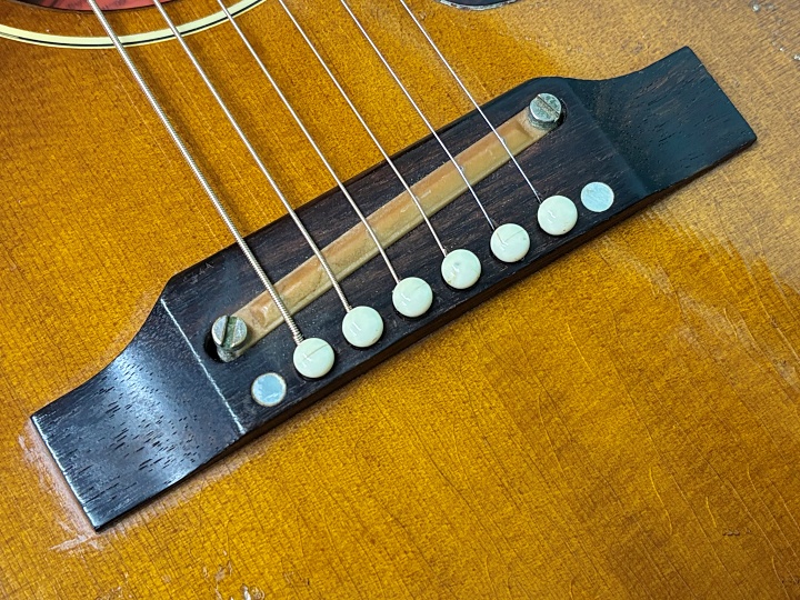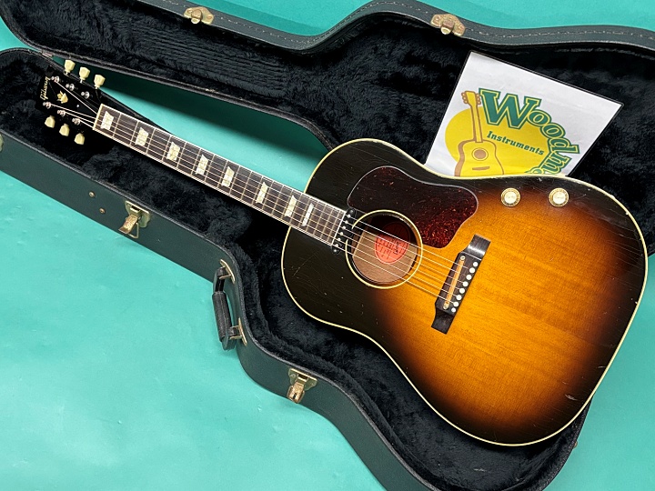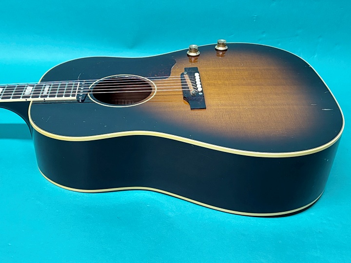 ビンテージのJ-160E同様、生音はそれほど大きくは鳴りません。カシャカシャとした独特なトーンで、ビートルズのレコードで聴くJ-160Eのサウンドそのものです。ピックアップ使用時はニッケルワウンド弦をおすすめします。付属品はオリジナルではなく後年のギブソンハードケースです。お探しの方はお見逃しなく!