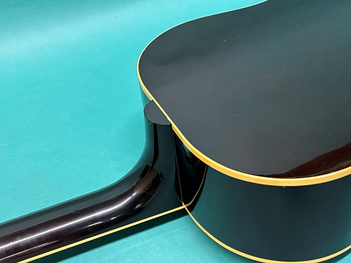 新品時から26年が経過しており、しっかりと使い込まれたコンディションの個体です。経年による塗装のウェザーチェックはもちろん、ボディトップには使用に伴う弾きキズ、スリキズ、ポツキズ、アテキズなどが点在しています。サイドにも引っかきキズやアテキズ、塗装のチェッキングが見られ、バックにもバックルキズやアテキズ、ウェザーチェックが点在しています。ネック裏には数か所の凹みキズがあり、特に深い箇所は4フレット裏にありますが、演奏上の支障はありません。ヘッドプレートやヘッドバックにもキズやウェザーチェックがあります。しっかり使い込まれ、特にボディトップは経年変化によってウェザーチェックが全体に入り、貫禄のあるルックスです。
