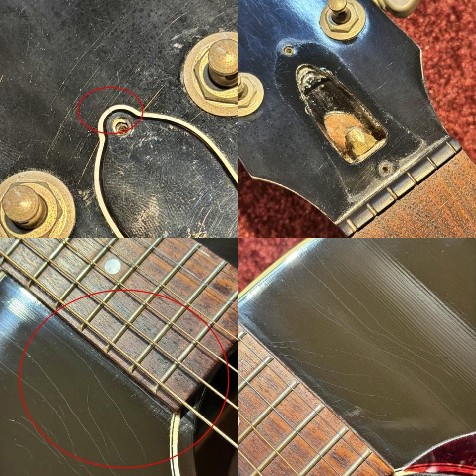 ・全体的に打痕や擦り傷、トラスロッドカバーの割れ、ブリッジ周りに塗装の傷み、ペグの強いくすみなど、使用感が見受けられます。