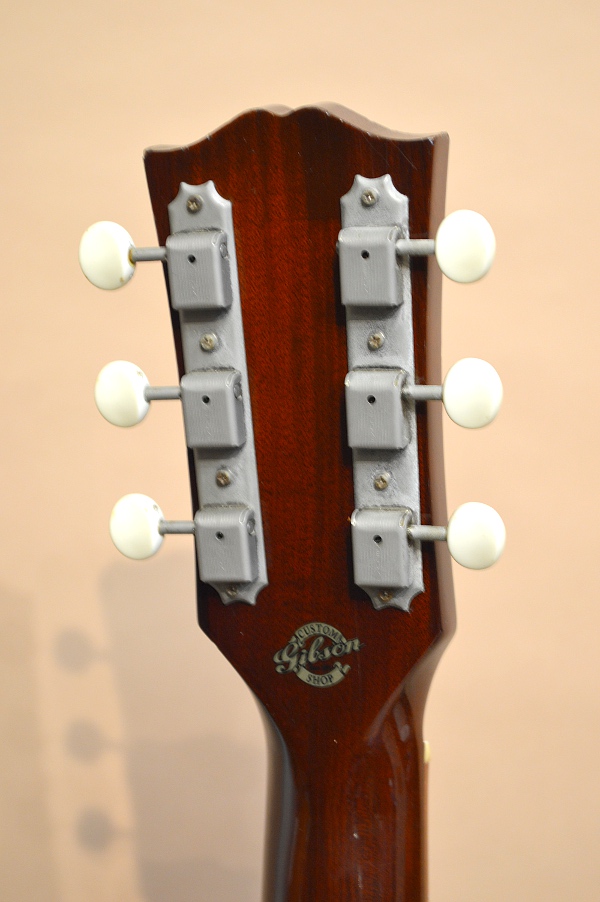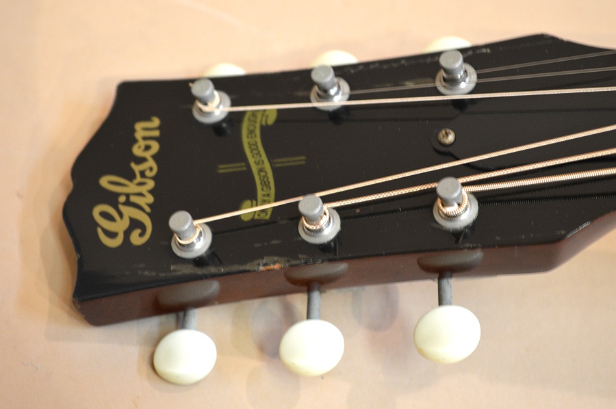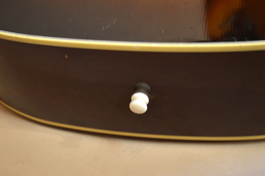 楽器のコンディションは、年式なりのキズや使用感、経年感などあります。ボディーの方は小キズがあちこちに見えるくらいで塗装の劣化はあまりありませんが、ヘッドの塗装にかなりの経年感を感じます。恐らくワインダーを引っ掛けたようなキズもアリ、ヘッド・トップはウェザーチェックやトップ・コートの浮き、一部塗膜がチップしている箇所もあります。また、6弦側のボディー・サイドのウエスト部辺りに5cmくらいのクラックが入り接着修理されています。修理跡はオーバー・スプレー等はされてないので、やや目立ちますが、しっかり接着され、ボディー内部からは補強のクリートも打たれていますので、強度的な心配はありません。ボディーの方にも小さい打痕や擦り傷など多数見つかりますので、決して極美品とは言えませんが、ギブソンはこの手のヤレが似合うギターなので、これはこれで風格ある佇まいになっているかと思います。また、過去にPUを搭載していたようで、エンドピンはオーバー・サイズの物にリプレイスされています。