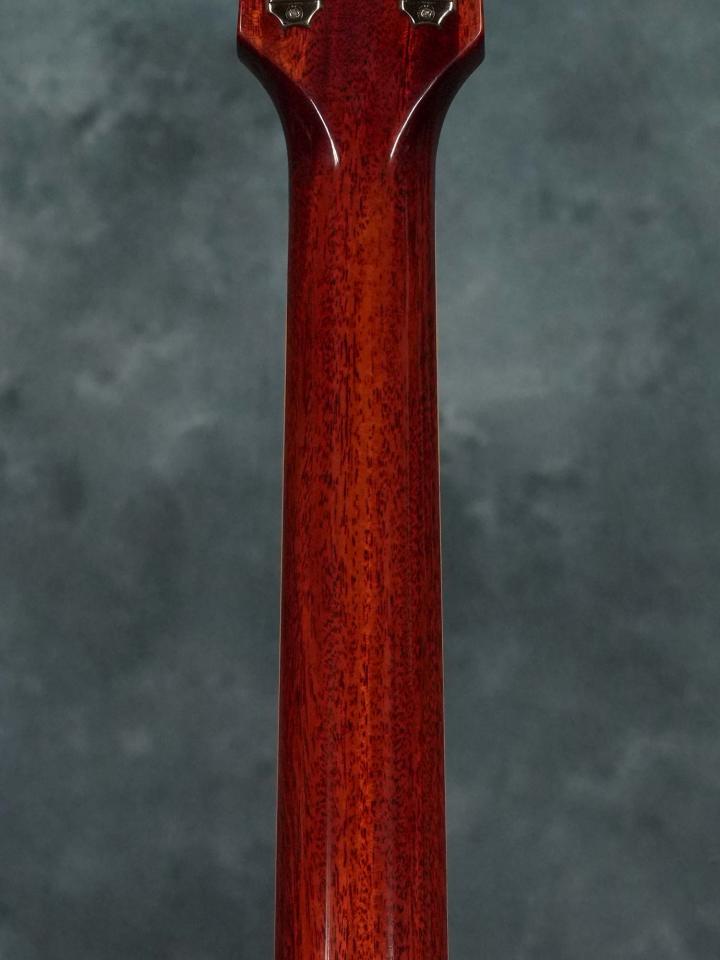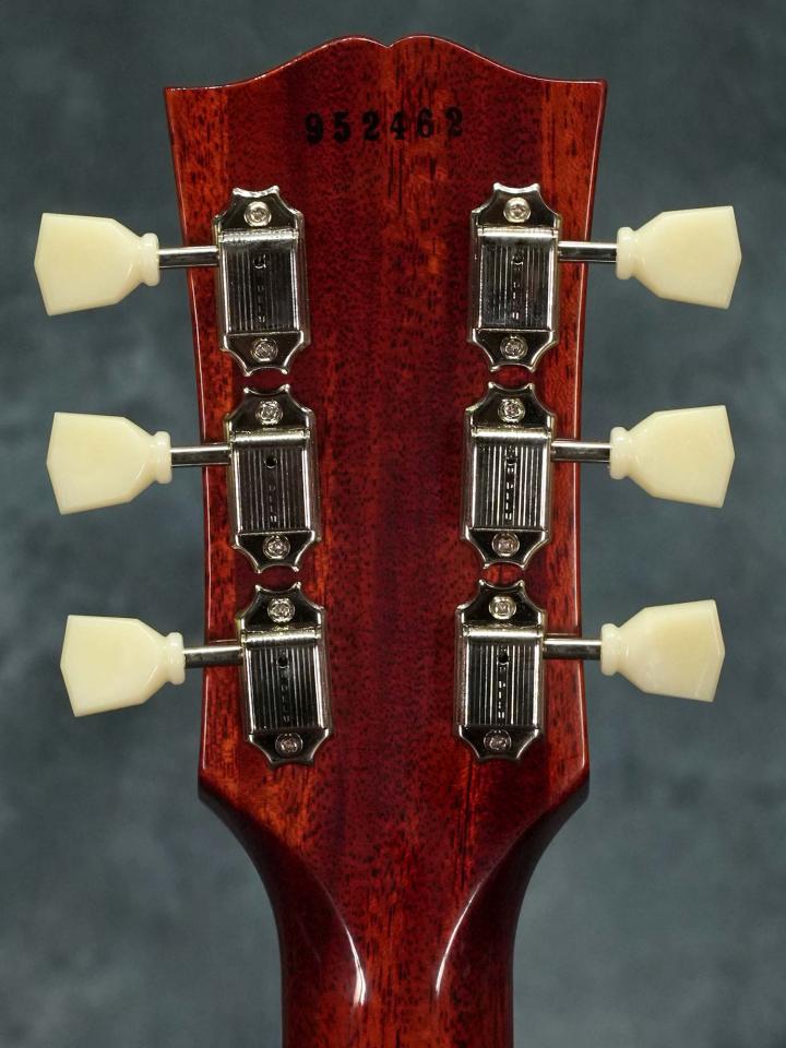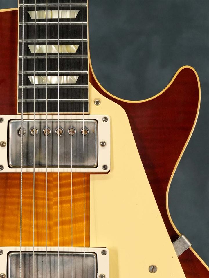 国内ディーラーがナッシュビルのGibsonファクトリーで厳選した杢目の美しいフィギュアドメイプルを使用したボディトップとマホガニーバックのボディに、マホガニーネック、ローズウッド指板、ピックアップはマグネットにアルニコ3ではなく「アルニコ2」を使用したアンポッテッドのCustombuckerを搭載し、ヴィンテージカーブを追求したポットやLUXEバンブルビーコンデンサ、ロゴ・インレイ・プラスチックパーツなどもよりオリジナルに近づけられた仕様です。