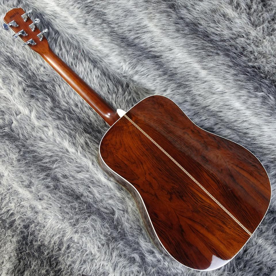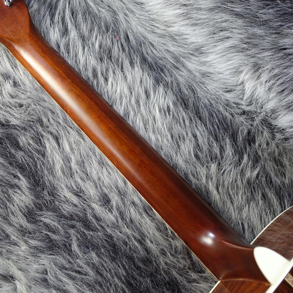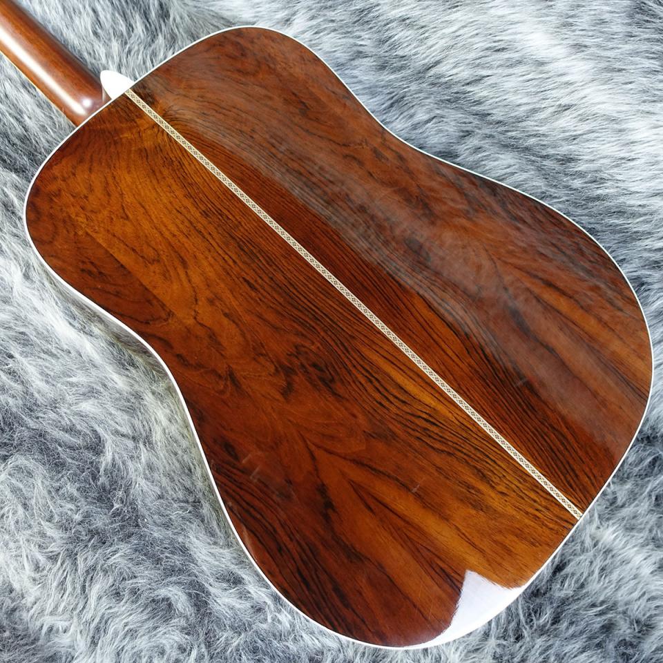 1990年代頃に製造された国産のドレッドノート型アコースティックギターです。最大の特徴は、サイドとバックに希少なハカランダ材(合板)を使用しています。