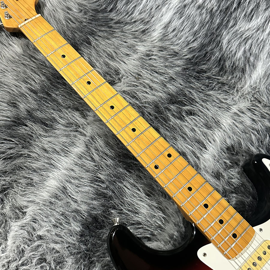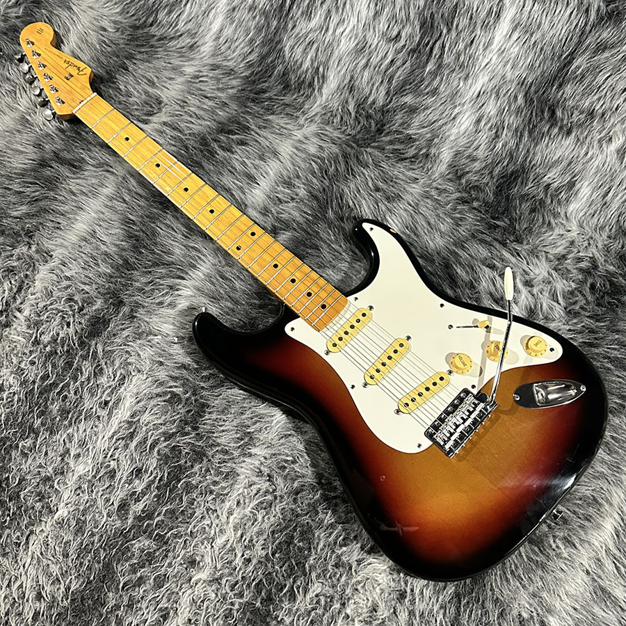 アルダーボディ、USピックアップ、筆記体のMade in Japan Nシリアルから1993年あたり製造と思われるST57-70が中古入荷しました。1Pメイプルネックと8点止め1Pピックガード、スパゲティロゴが特徴的な57年スタイル。日本製らしい丁寧な作りが魅力の1本です。