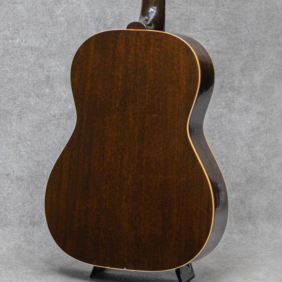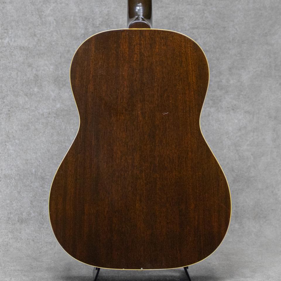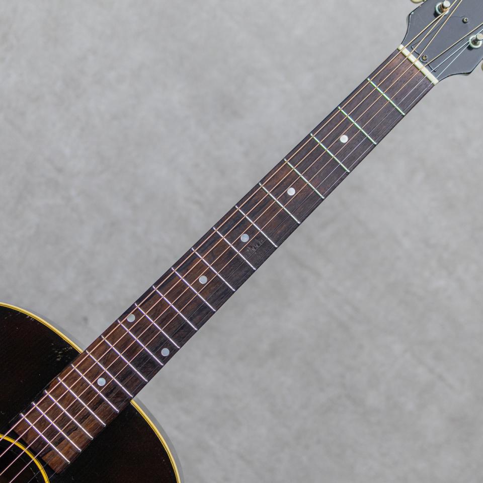 スモールギブソンの定番人気モデルLGシリーズ。1942年からラインナップされ、1970年代の中後期まで長きに渡り人気を博したシリーズで、ラダーブレイシングの"LG-1"、Xブレイシングの"LG-2(B-25)"、Xブレイシングナチュラルフィニッシュの"LG-3"、そして1958年に追加されたマホガニートップの"LG-0"と幅広い層にアプローチされたスモールモデルです。本器は1954年製"LG-2"。スプルーストップ、マホガニーサイド&バック、マホガニーネック、ハカランダ指板&レクタングルブリッジ、シングルリングロゼッタ、べっ甲柄スモールガード、スキャロップドXブレイシング。ペグは"No letter"クルーソン3連ペグのリプレイスメントに交換されていますが、とても雰囲気も良くマッチングしています。明瞭なレンジ感でバランスよく乾いたグッドな響きを楽しませてくれる本器。小気味良く乾いた響きが明るく快活なサウンドですが、Xブレイシングによる豊かな倍音感とエアー感、音圧も存分に伴った弾き応え。ストロークのニュアンスもしっかりと表現の幅を楽しませてくれます。各所のウェザーチェック、細かな塗装チップや小傷、サウンドホールのピッキングウェアなどはあるものの、いずれも経年相応の雰囲気良い様子で外観を大きく損ねるものはなく、ビンテージらしいグッドルッキンを持った本器。各所綺麗にコンディションを維持され、ネックまわりもとても良好で弾きやすいアクションを保っています。ブリッジプレートの交換、バック1限側くびれ部のヘアラインクラックの補修が見られますが、いずれも丁寧に補修されています。いつでも手元に置いておきたくなる良好なルックスとプレイコンディションをキープした1本。是非お見逃しなく。ハンドル部の保守が見られますがオリジナルチップボードケースが付属します。