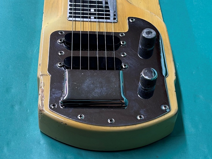 60年以上経過した楽器としては、比較的綺麗なコンディションですが、指板ボードのピッキングする箇所の印刷が剥がれています。他にも通常使用によるわずかなキズが点在していて、塗装の艶もやや渋くなっています。