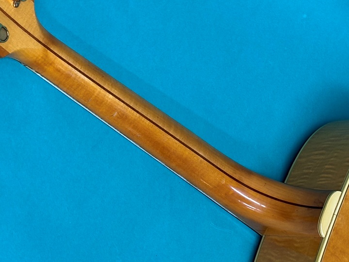 渋く焼けたナチュラルブロンド、バリッと芯のあるタイトでいて華やかなサスティーン感のあるトーンが特徴の17インチジャンボメイプルモデルです。