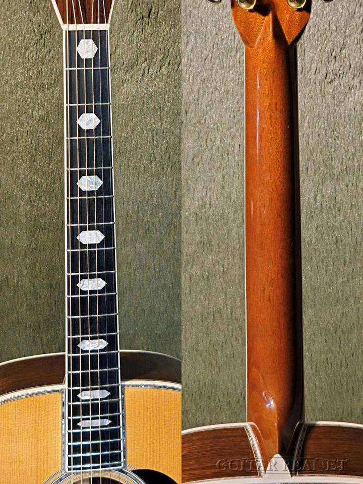 スクエアロッド並みに太いネックシェイプでありながらトラスロッド調整が可能な点や、ジャーマン・スプルースに非常に近い音響特性を持つアルパイン・スプルース、ソリッドの指板インレイを採用している点など、ヴィンテージへのリスペクトと現代的な扱い易さを共存させた当時の担当者のこだわりが垣間見える良いカスタムだと思います。
