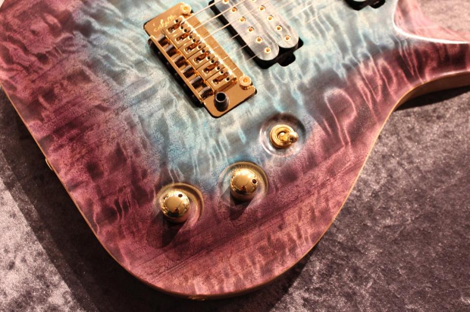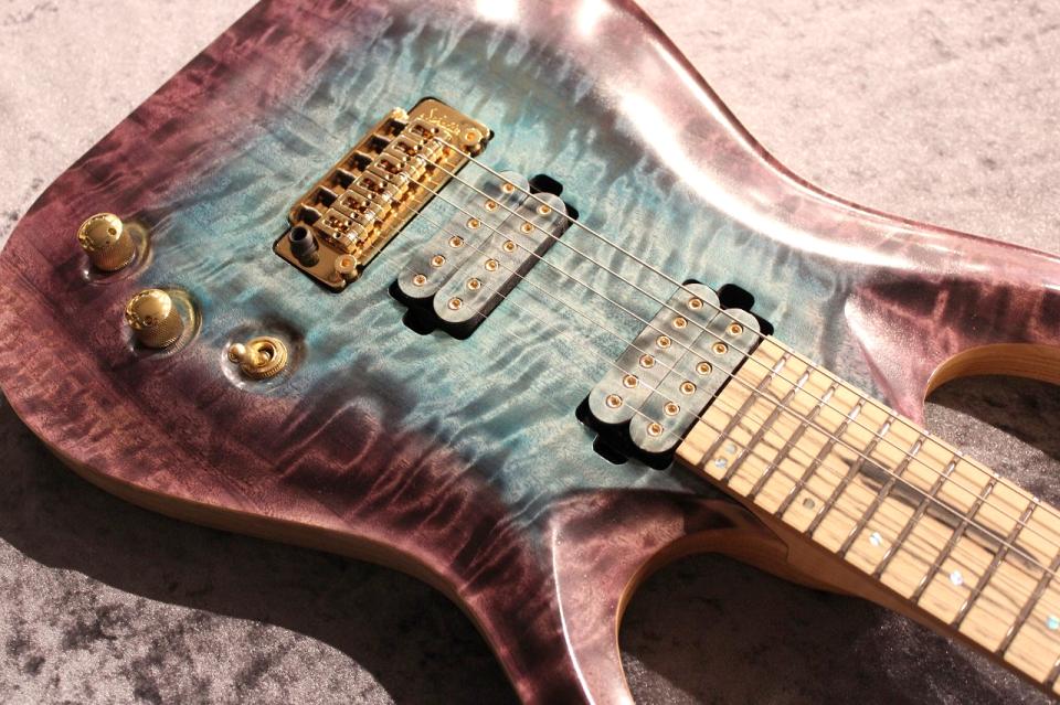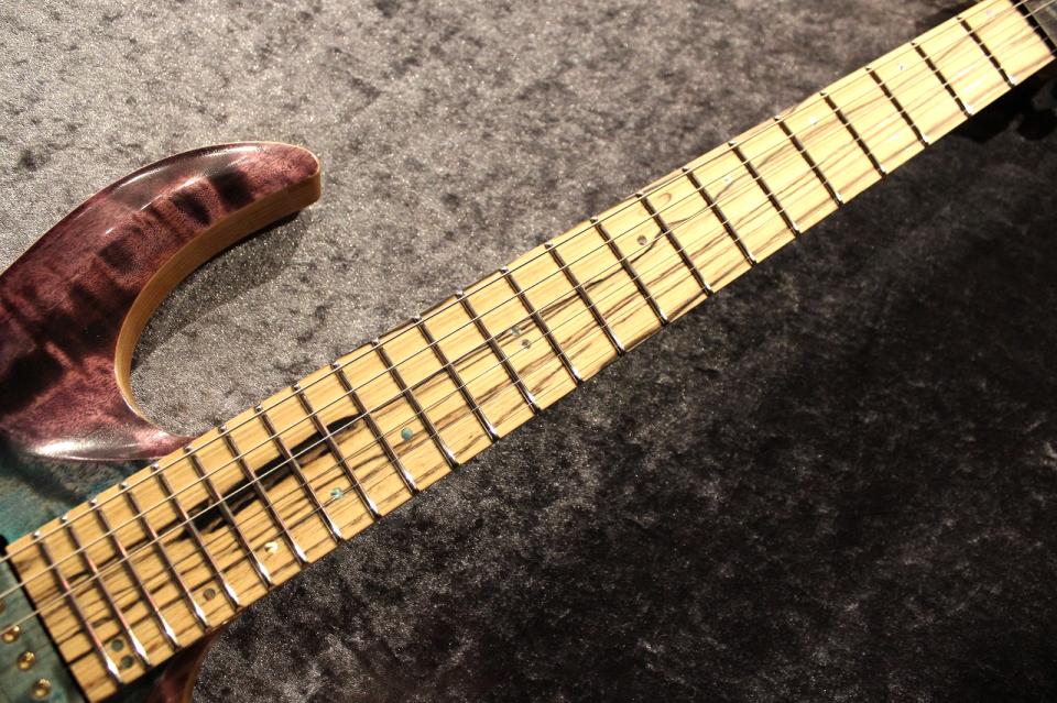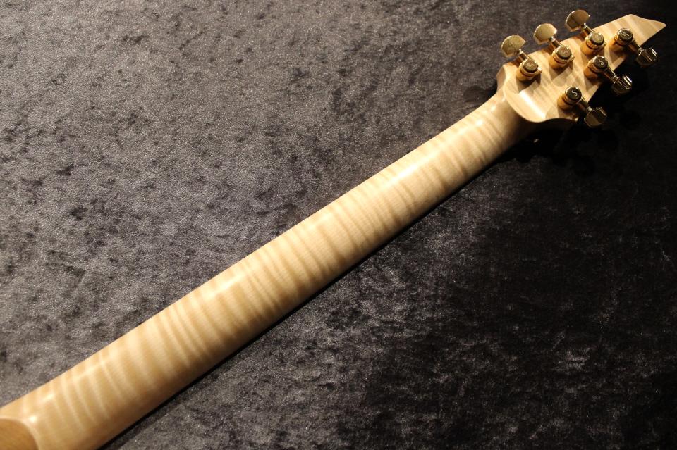 また、今回のオーダー品のカーブトップ仕様の個体には指板にペールムーンエボニーを、ネックには美しいフレイムが出たメイプルを使用しております。