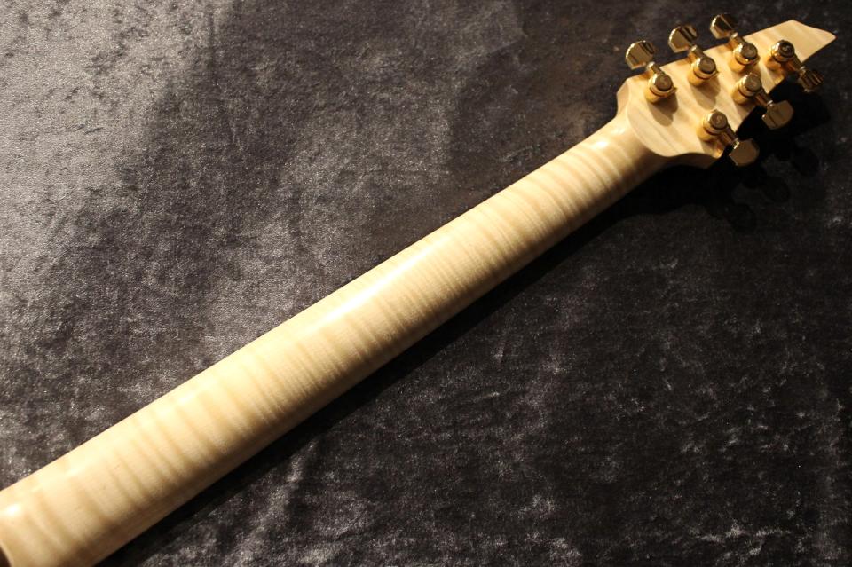 また、今回のオーダー品のカーブトップ仕様の個体には指板にペールムーンエボニーを、ネックには美しいフレイムが出たメイプルを使用しております。