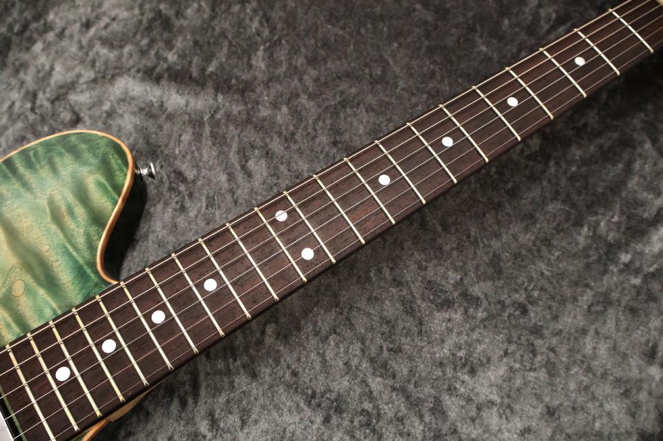 先述の通りこちらの個体はアッシュをボディーに使用しており、Ashの硬質さや締まりは活かしつつも色気や柔らかさを加えたサウンド仕上げたいと考えておりましたので、指板にはローズウッドを採用しました。