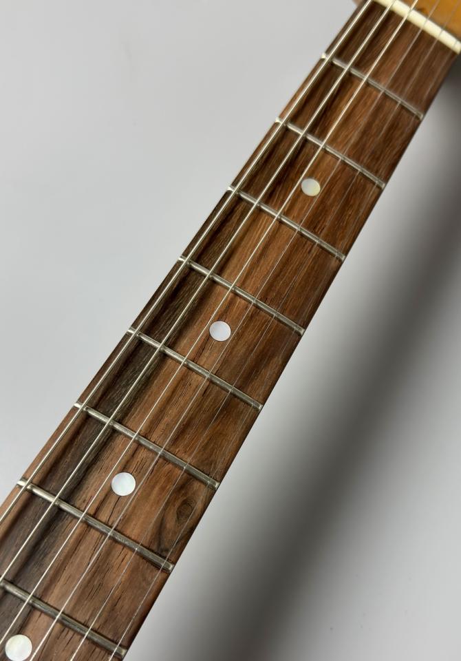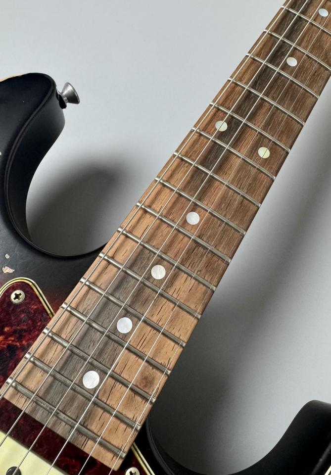 薄く仕上げられた極薄ラッカー塗装と自然なレリック加工が、音抜けとルックスの両面でヴィンテージらしい雰囲気を漂わせます。