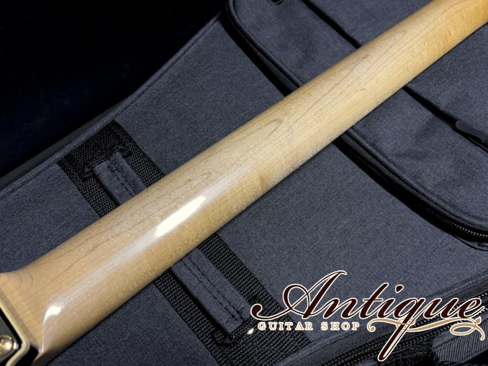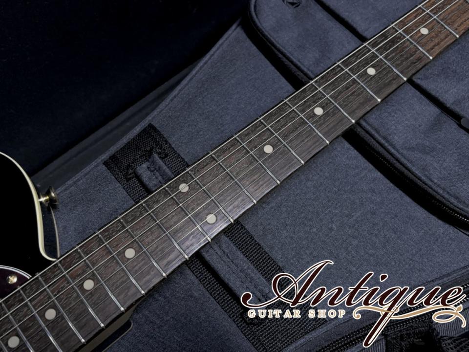 まずそのスペックとしては、ボディにはヴィンテージ同様に2Pのアルダー材が採用され、フィニッシュには1957 Les Paul Customを意識して調色したBlack Beautyカラーをセレクト。同じ黒系のJet BlackやPiano Blackとは異なり、深味のあるヴィンテージライクなカラーリングとなっております。また塗装自体はツヤ感とマット感が混在するHalf Vintage仕上げにて、ヴィンテージにも共通する激渋のルックスとなっております(本体に記載がありませんが、塗装のやれたニュアンスから判断しております。)。ボディトップ&バックに施されたバインディングも焼けたニュアンスが再現されております。続いてネックにもヴィンテージを意識したトーン重視のフラットソーン(板目取り)のメイプルにて、角度によってフレイムやバーズアイが浮かぶ非常に良質な材が採用されております。指板にはダークなコントラストのインディアンローズウッドが採用され、ポジションマークもオリジナルさながらのクレイドットマーカーが施されております。ヘッドはボディカラー同様となるマッチングヘッド仕様にて、Fenderスパロゴライクなゴールドロゴ、そしてブラックフィニッシュに最高にマッチするゴールドハードウェア&鼈甲ガードにより、オリジナルには存在しないスペックだからこそ、唯一無二を感じさせる抜群のルックスとなっております。細部スペックとしては、648mmロングスケール、Jescar 55090(6105相当)ミディアムフレット、ツバ出し22F仕様、指板Rは300mmにて、復刻モデル等で見られるモダンラディアスよりもフラット。約41.5mmナット幅に若干薄目のCシェイプ、チューナーはクルーソンスタイル、4点プレート留めボルトオン、ブリッジサドルは溝切無しの3点となっております。