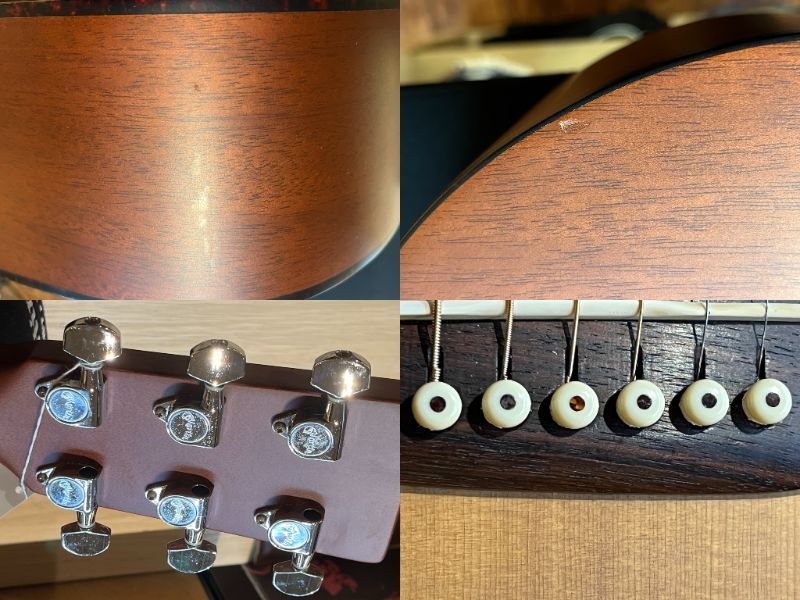 ブリッジに写真に写すことが困難な程度の擦り傷あり。弦交換の際についた傷かと思われます。