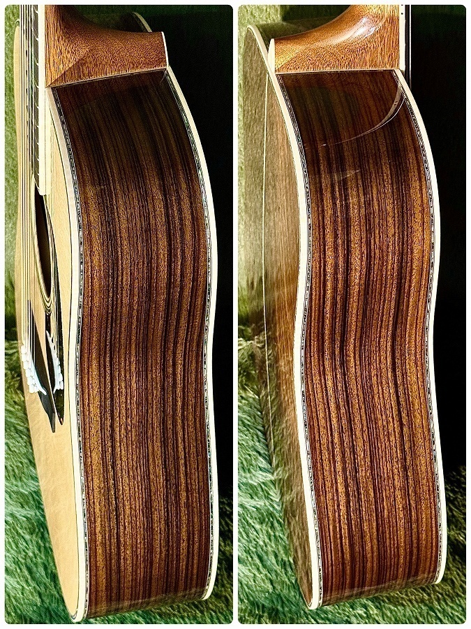 どちらもプレミアムグレードの物を採用しており、気品溢れるトップ材の杢目・今回のモデルを象徴する豪快な板目の表情が良い意味で対になっているアンバランスで見ているだけで惚れ惚れしてしまいます。