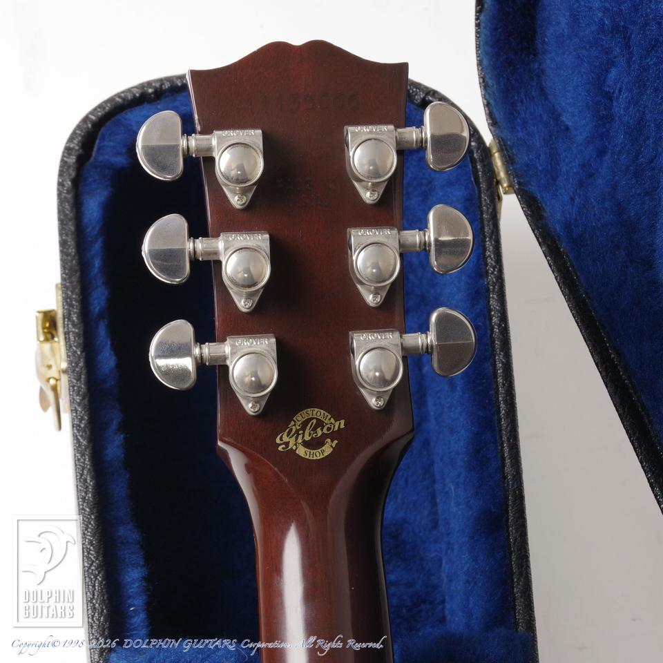 ヘッドの裏側にカスタムショップのロゴがデザインされており、トップ材がアディロンダックスプルースに、ピックガードがラージガードとなるなどのカスタムが施されております。
