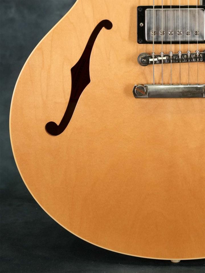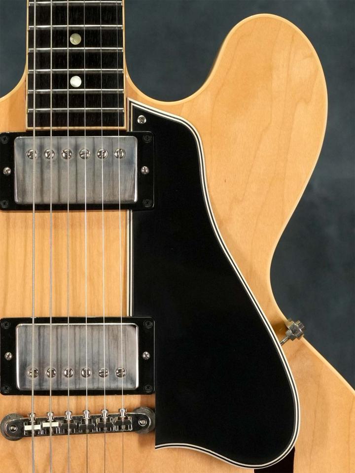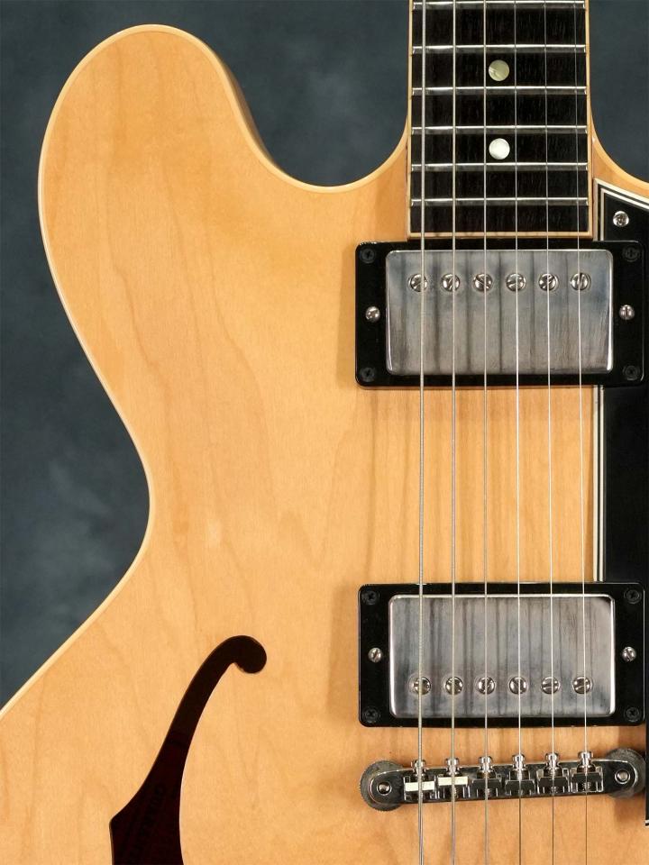 Les Paulなどに採用されるフィギュアドメイプルではなくプレーンなラミネイトメイプルにナチュラルフィニッシュは独特の色気が有り、オリジナルでは非常に希少な通称「ブロンド」カラーのサンサンゴ。ソリッドセンターブロックによる太くアタック感の有るセミアコサウンドはクリーンでも歪ませても心地よく、コンディション良好かつしっかり使える上質なセミアコをお探しの方にオススメの一本です。