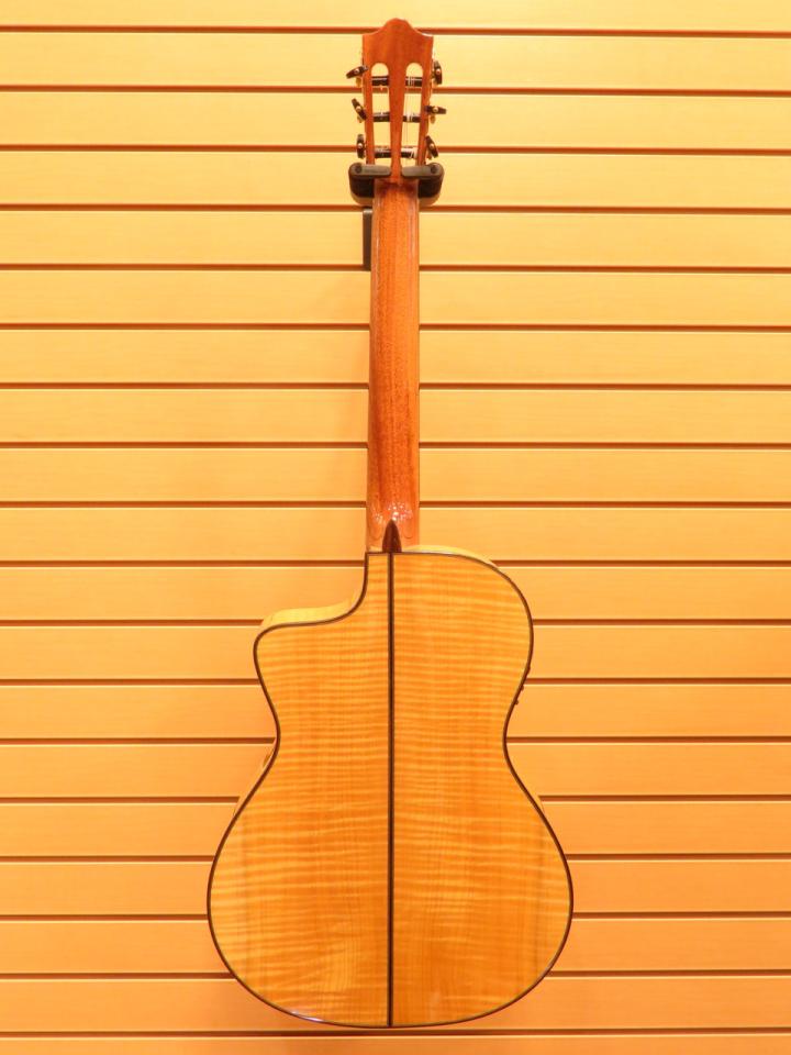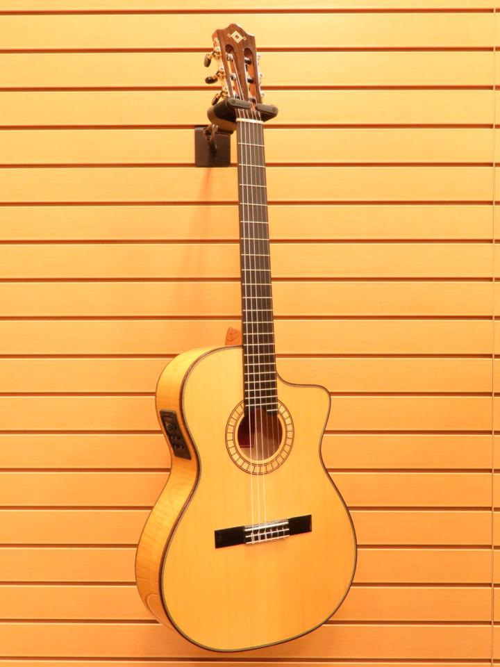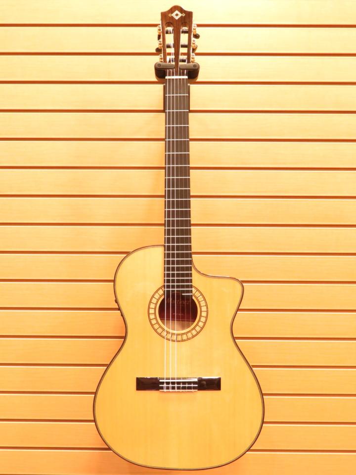 確かなつくりのクラシックギターに音域の幅を広げるカッタウェイを施し、ピックアップを搭載したエレガットモデル。通常よりも短い640mmスケールに47mmの細身のネック、さらに14フレットでジョイントすることで通常のクラシックギターでは得られない演奏性の幅広さと弾きやすさを実現しています。ピックアップには世界的メーカーのフィッシュマン製を搭載、アンダーサドルとコンデンサーマイクをブレンドし、エアー感のあるサウンドを放ちます。