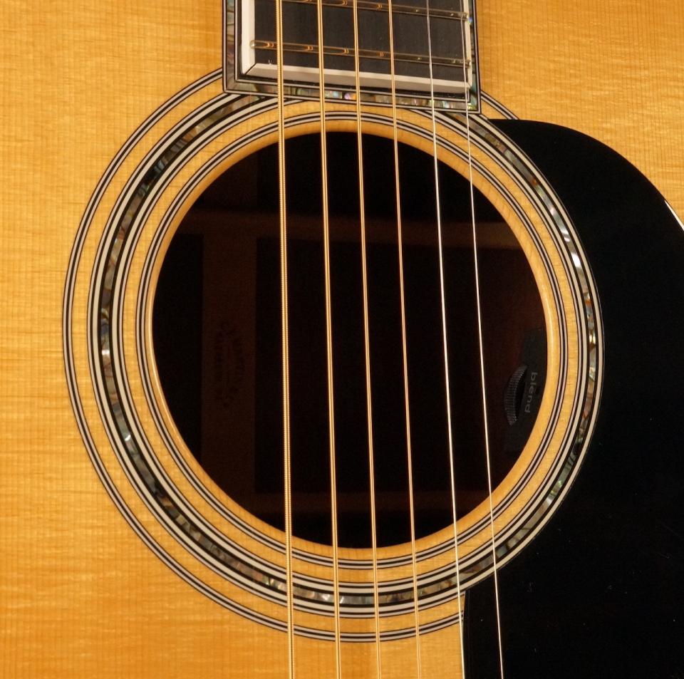 アンダーサドルPUの安定した出力と輪郭感に、コンデンサーマイクの空気感や生っぽさをブレンドできる優秀なシステムで、ライブや録音での使い勝手も良好です。見た目や生鳴りの魅力にとどまらず、現場でしっかり活躍できる仕様になっているのも本器の大きな強みと言えるでしょう。