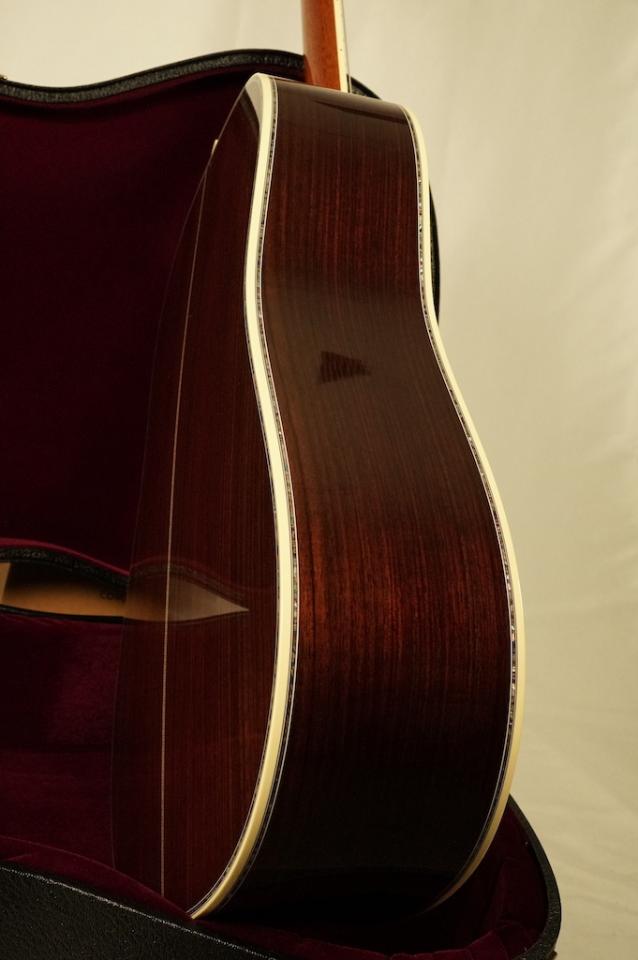 サイド&バックには最上位インディアンローズウッドを使用し、しっかりと目の詰まった黒々として美しい柾目をもちます。シン・フィニッシュ(極薄ラッカー塗装)によってその潜在的な共鳴を余すことなく引き出しています。