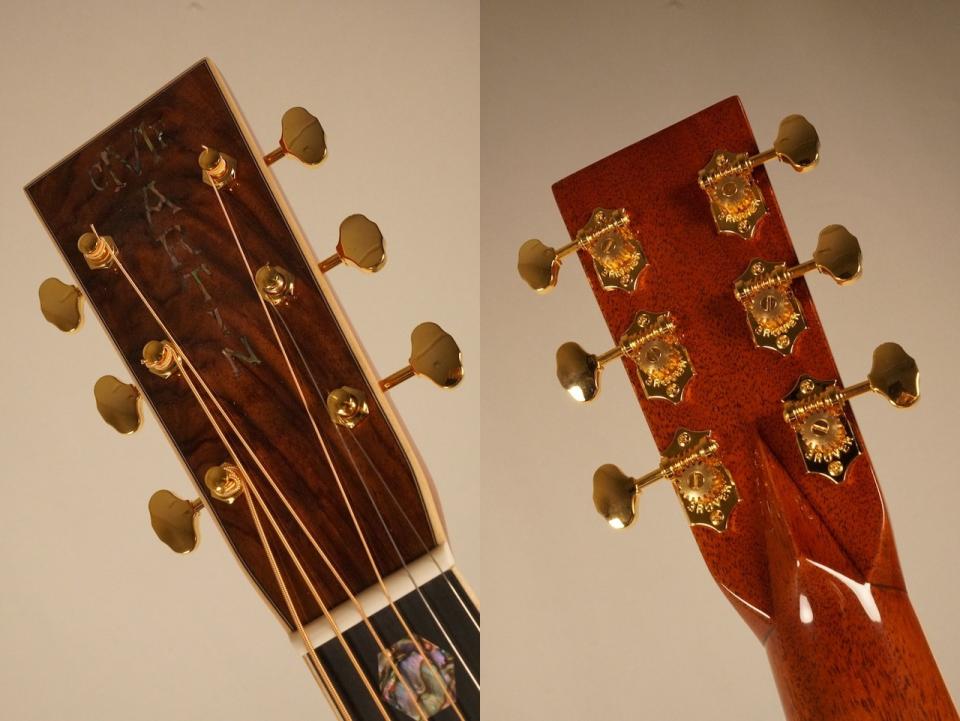 指板・ブリッジには漆黒のブラックエボニーを用い、Style 45グレードならではのセレクト・アバロン装飾が随所に施されています。特筆すべきは、ヘッドプレートにもプレミアムグレードのワイルド・グレイン・イーストインディアン・ローズウッドを採用。
