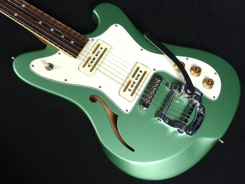 ルックス的にも非常にマッチしたビグスビーB50トレモロを搭載、Fホールを備えたセミホロー構造のボディーは、エルボー・カットを施してあり、演奏面にも気を配った構造となっております。