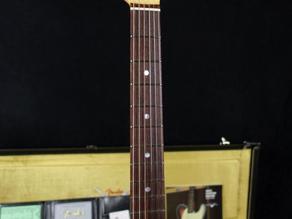 ラージヘッドなど大きな特徴はもちろんのこと、通称Fシリーズのネックプレート、短期間にのみ採用されたトランジションロゴ、パールインレイのドットポジションマーク、また本モデルの最大の特徴でもあるツバ出し22フレット仕様、カスタムショップ製のリイシューモデルではなかなか見ない珍しい仕様のオーダー品となっております。