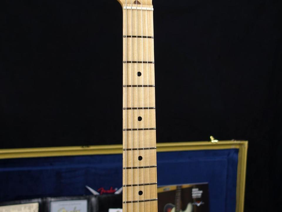 本機は贅沢に1ピースアッシュボディに1ピースメイプルネックを採用した、クローゼットクラシック仕上げの55ストラト。