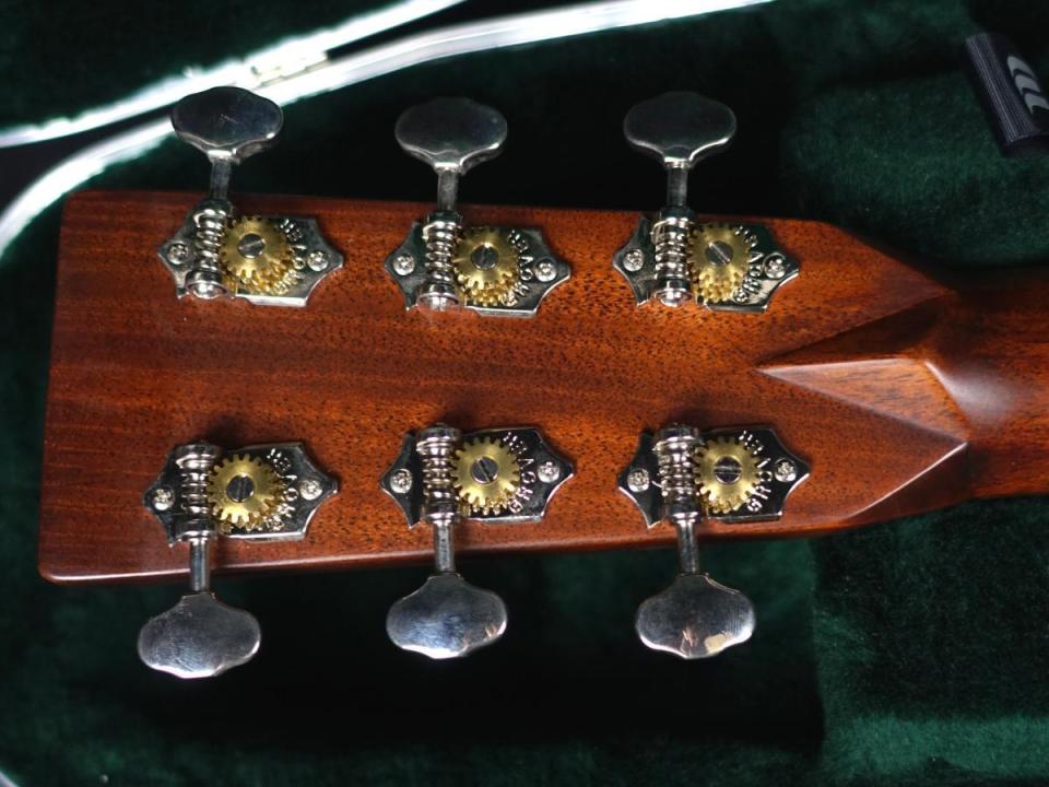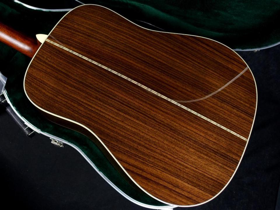 マーチンのありがちなボディくびれ部分のバインディング塗装の吸い込みや、木部の道管部分の塗装の引きなど若干ですが感じられます。
