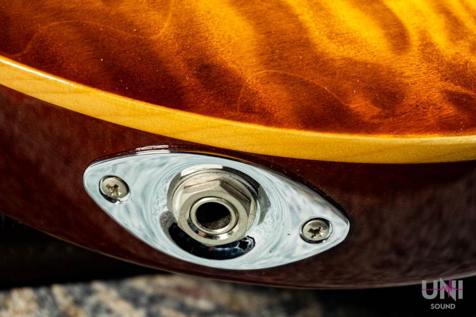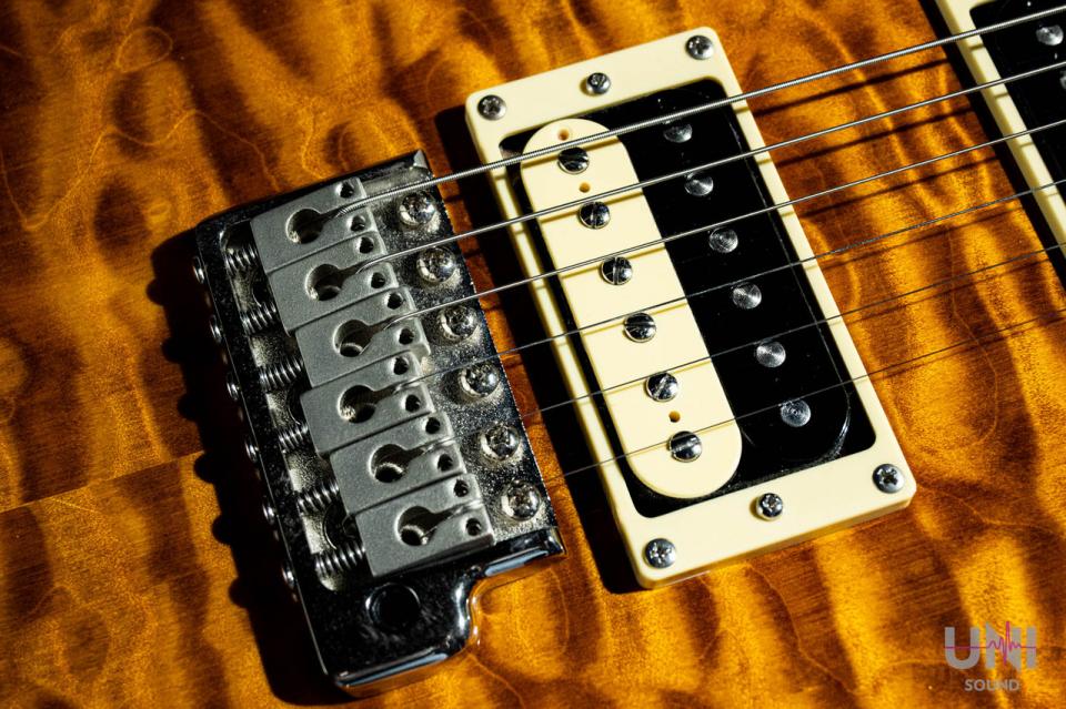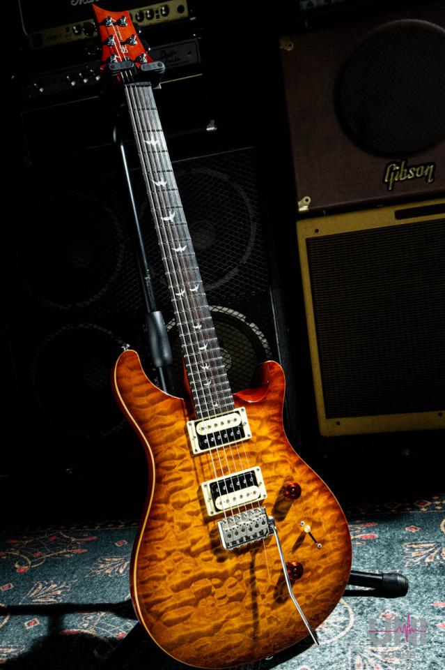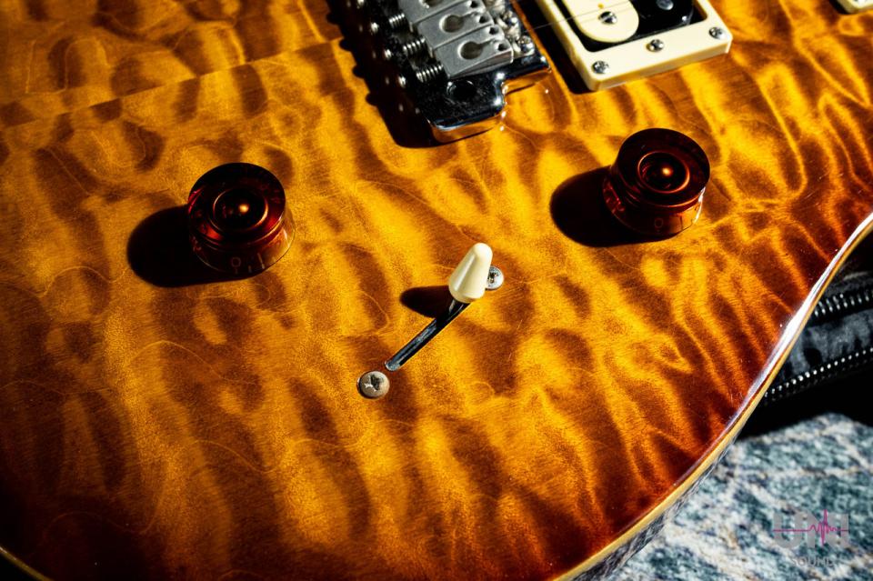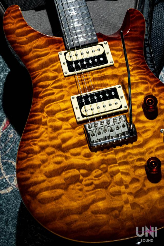 当時のSE Custom 24はフレイムメイプルトップが基本ですが、本機は記念仕様としてキルトメイプルを採用。